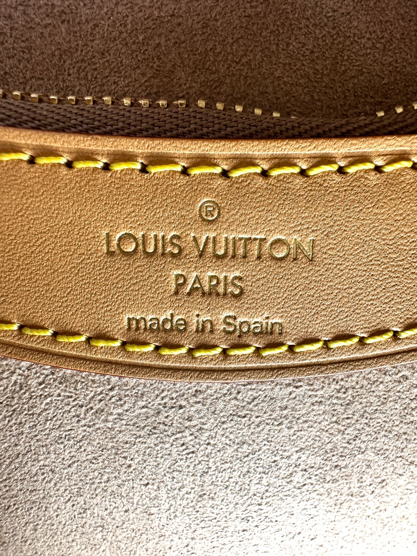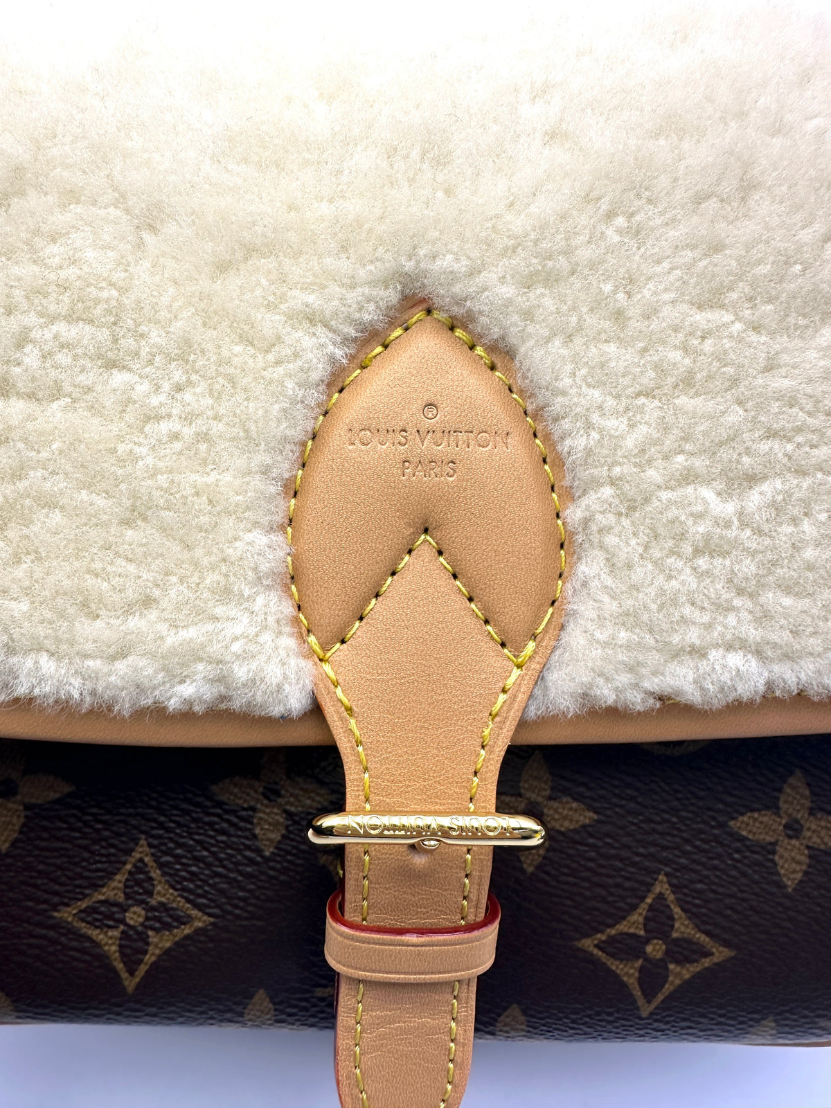 Material: Monogram Coated Canvas and Cream Shearling with Vachetta Leather Trim