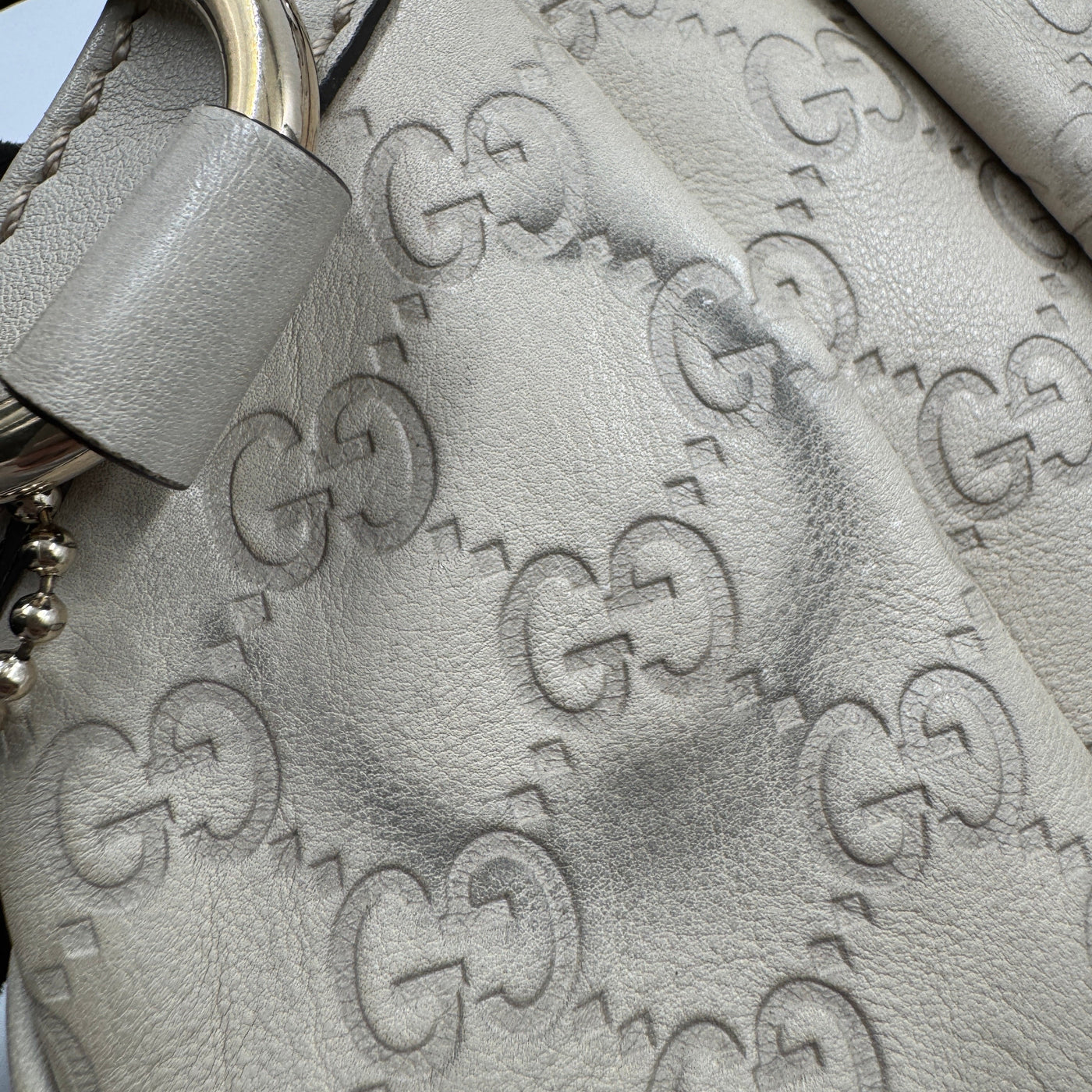 1. Material:Made from Guccissima leather, which is embossed with the iconic GG logo pattern. The pattern adds texture to the leather, creating a distinct and luxurious look.The Mystic White color gives the bag a clean, fresh, and elegant appearance, perfect for both casual and more formal occasions.The leather is smooth and supple, providing both durability and a soft touch, making it comfortable to carry.